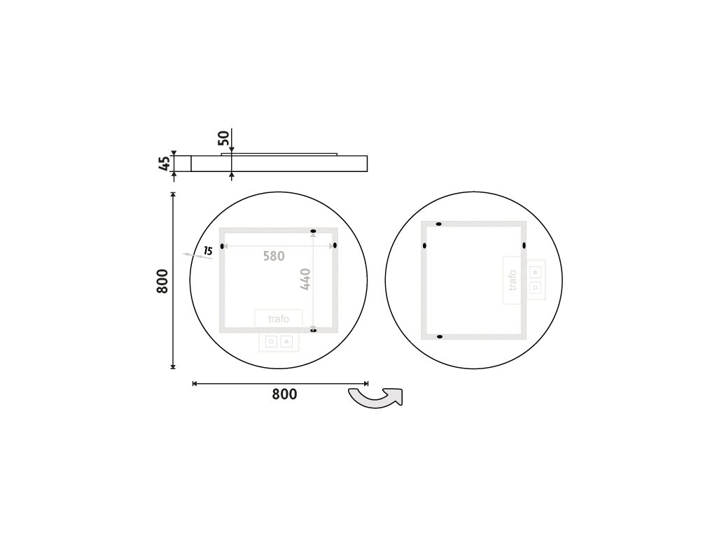 Kulaté zrcadlo s rámem a s celoobvodovým svícením pro dokonalé a rovnoměrné osvětlení.Zrcadlo se ovládá dvěma dotykovými podsvícenými senzory, které umožňují změnu barvy světla, nastavení intenzity osvětlení (stmívání) a disponují paměťovou funkcí pro uložení posledního nastavení. Kromě toho lze zrcadlo ovládat i pomocí nástěnného vypínače, což zvyšuje jeho flexibilitu a pohodlí použití.