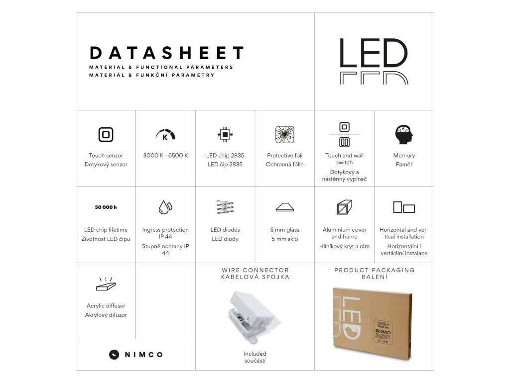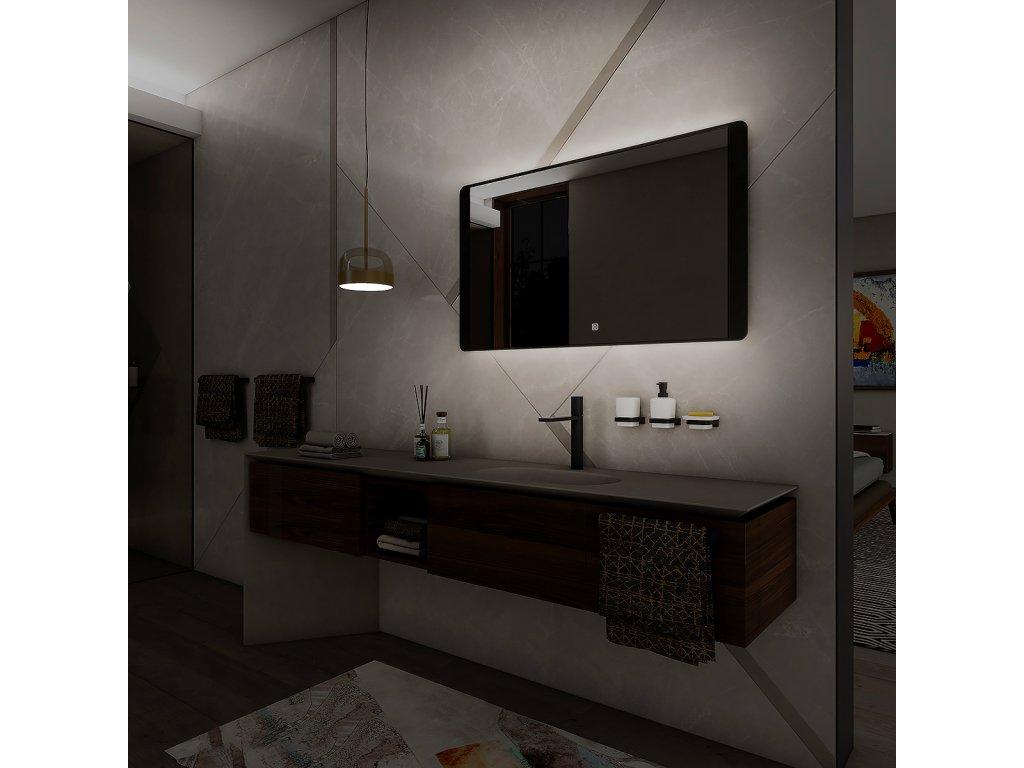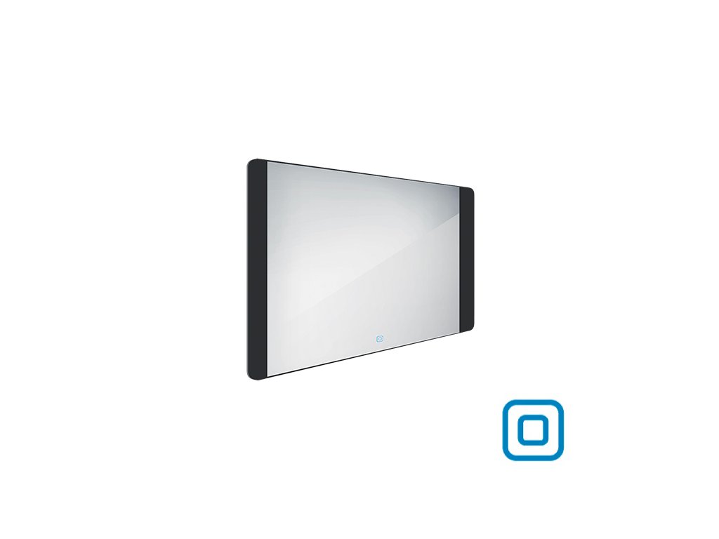 Černé zrcadlo do koupelny 100x60 s osvětlením, černým rámem, dotykový senzor je skvělým doplňkem do koupelny. Zrcadla do koupelny NIMCO vynikají kvalitním zpracováním a moderním designem. Zrcadlo o tloušťce 5 mm je zapuštěné do masivního černého matného rámu. Rám zrcadla je z hliníku. LED pásky jsou zabudované v liště z akrylového skla. Akrylové sklo lépe rozptyluje světlo a chrání Led diody před vlhkostí. Lišta je umístěna za rámem zrcadla. Světlo vychází do prostoru za zrcadlem a vytváří tak zajímavé ambientní svícení. Zapínání / vypínání / ovládání je pomocí dotykového senzoru s pamětí. Možnost nastavení barevné teploty svícení od studené bílé až po teplou bílou. Životnost LED diod je až 50 000 hodin. Ochrana IP 44. Připojení 220-240 V. Součástí zrcadla je kabelová propojovací krabice, IP 44.Rám černý matný, oblé rohy