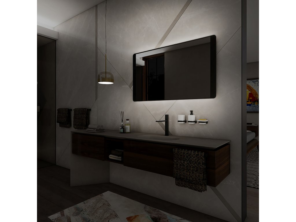 Obdélníkové zrcadlo s rámem s oblými rohy a podsvícením ze spodu a shora pro rovnoměrné a stylové osvětlení.Zrcadlo bez integrovaného vypínače je určené k připojení a ovládání nástěnným vypínačem. Barva podsvícení zrcadla je pevně nastavena.