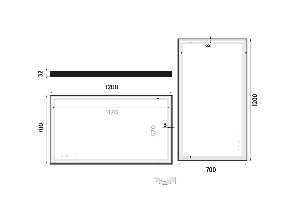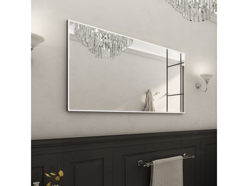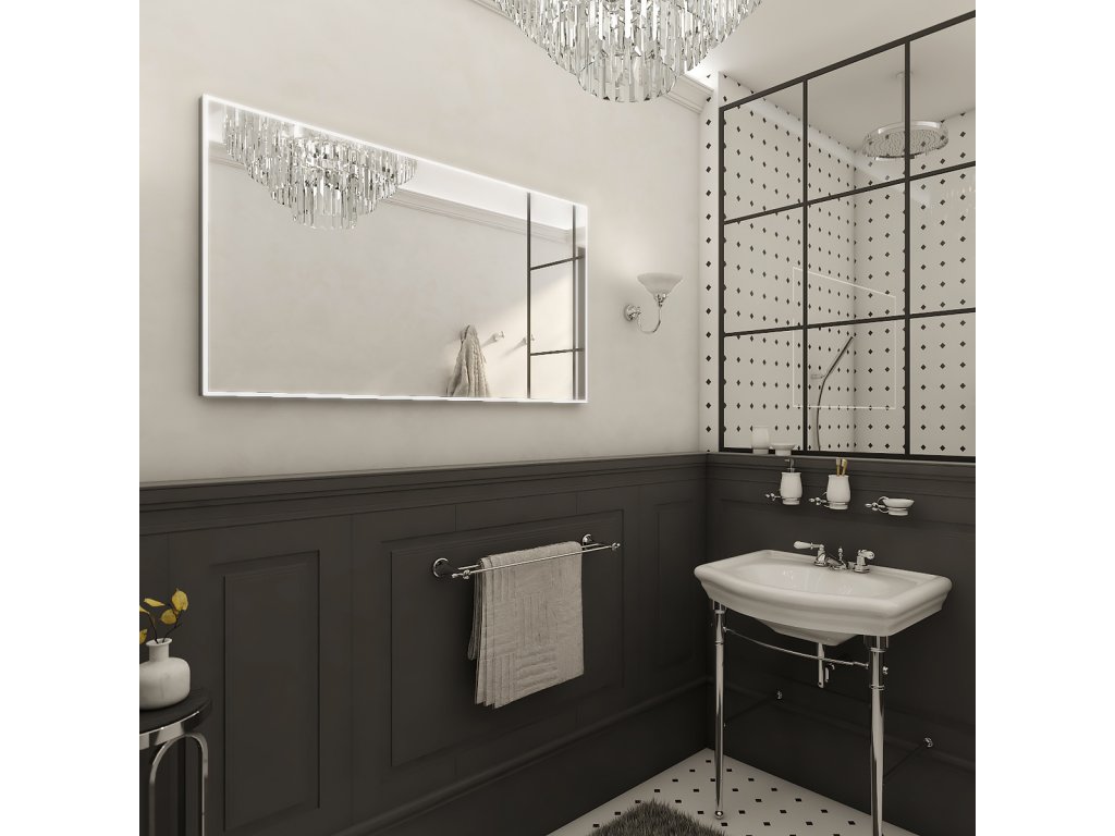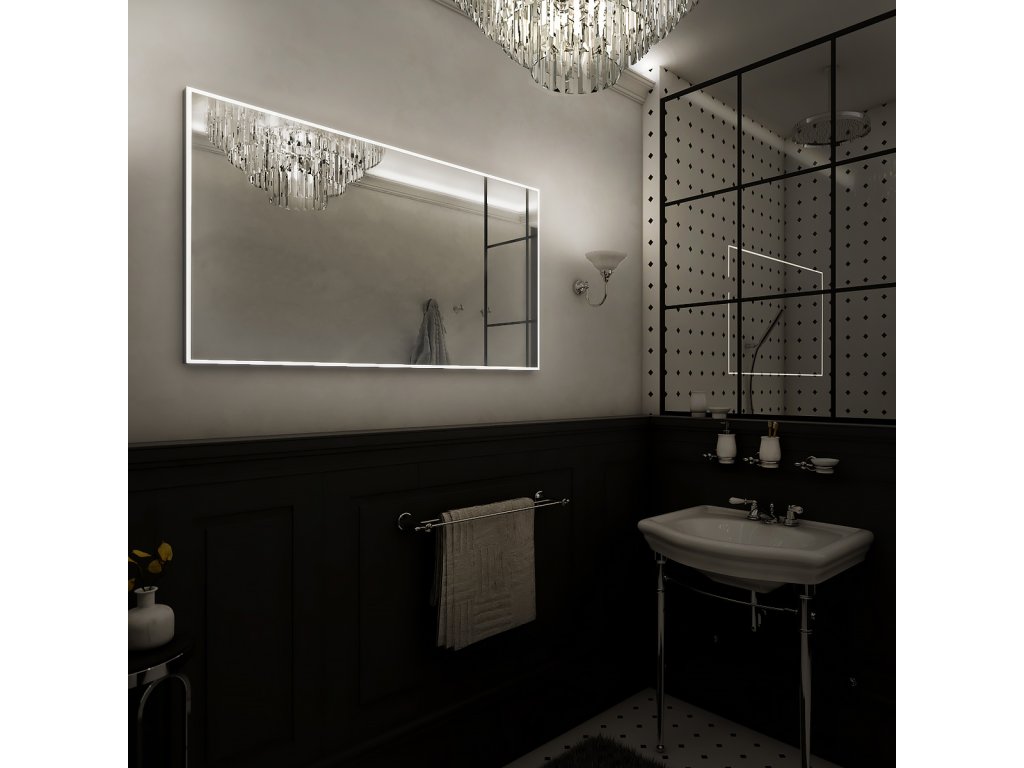 Obdélníkové zrcadlo s rámem s ostrými rohy a celoobvodovým svícením pro dokonalé a rovnoměrné osvětlení.Zrcadlo bez integrovaného vypínače je určené k připojení a ovládání nástěnným vypínačem. Barva světla zrcadla je pevně nastavena.
