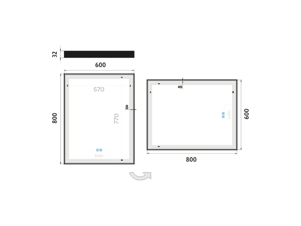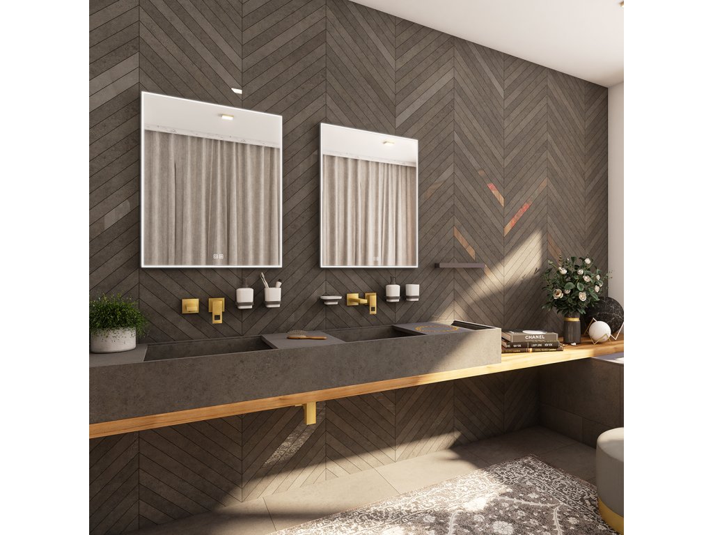 Obdélníkové zrcadlo s rámem s ostrými rohy a celoobvodovým svícením pro dokonalé a rovnoměrné osvětlení.Zrcadlo se ovládá dvěma dotykovými podsvícenými senzory, které umožňují změnu barvy světla, nastavení intenzity osvětlení (stmívání) a disponují paměťovou funkcí pro uložení posledního nastavení. Kromě toho lze zrcadlo ovládat i pomocí nástěnného vypínače, což zvyšuje jeho flexibilitu a pohodlí použití.