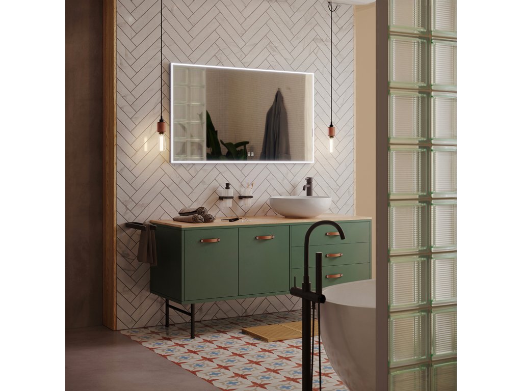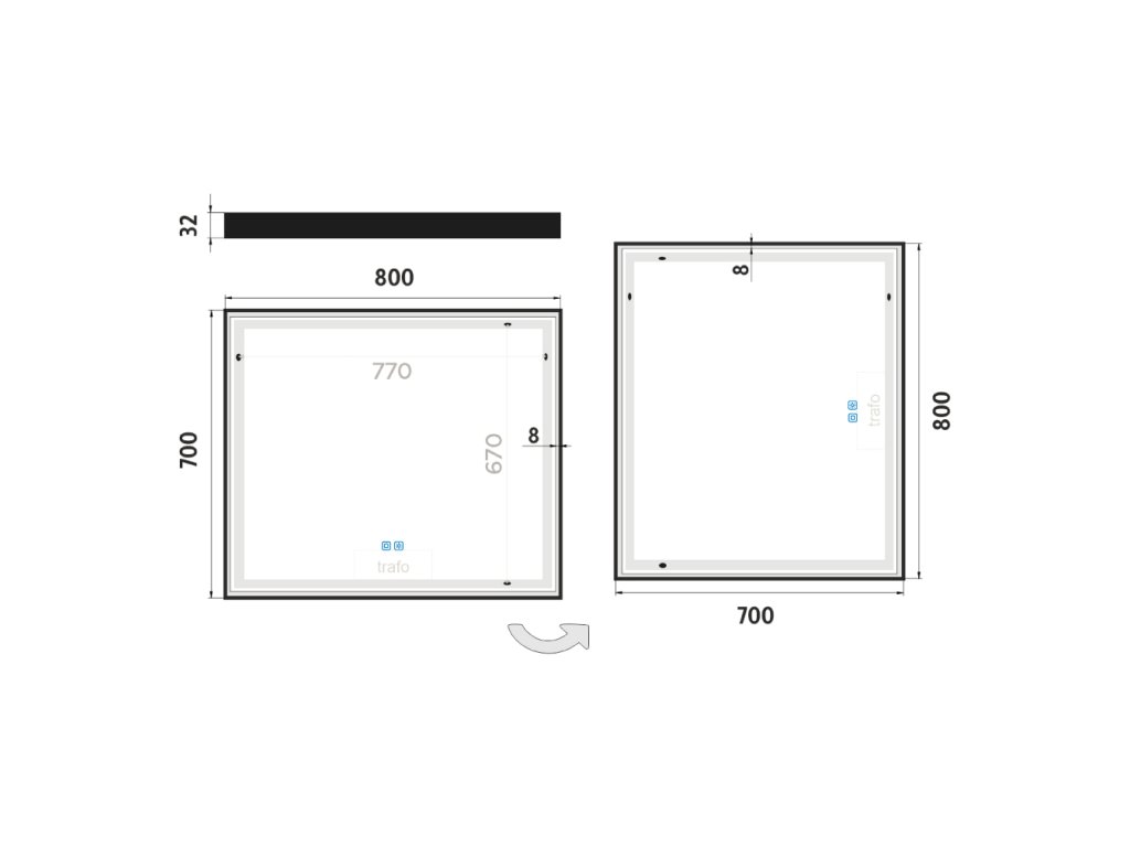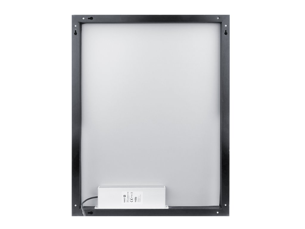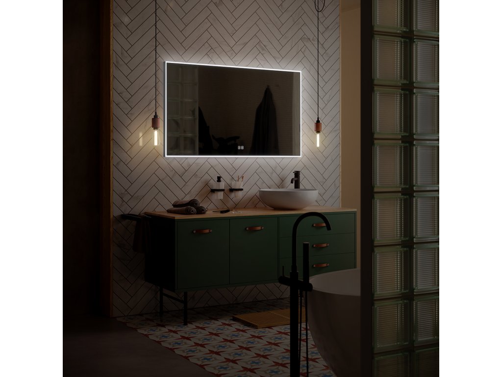 Obdélníkové zrcadlo s rámem s ostrými rohy a celoobvodovým svícením pro dokonalé a rovnoměrné osvětlení.Zrcadlo se ovládá dvěma dotykovými podsvícenými senzory, které umožňují změnu barvy světla, nastavení intenzity osvětlení (stmívání) a disponují paměťovou funkcí pro uložení posledního nastavení. Kromě toho lze zrcadlo ovládat i pomocí nástěnného vypínače, což zvyšuje jeho flexibilitu a pohodlí použití.