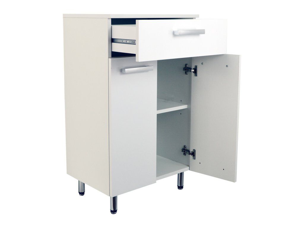 Korpus skříněk, čelní plochy a police jsou vyrobeny z LTD desky. Čela skříněk jsou lakované lesklým bílým lakem.