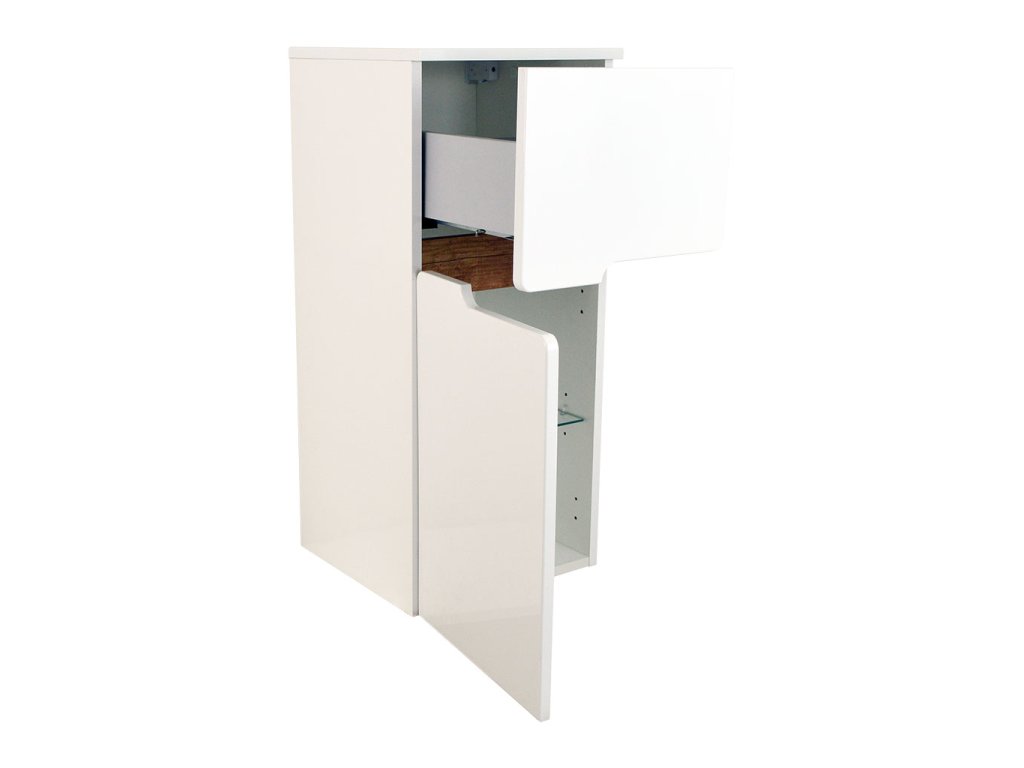 Doplňková koupelnová skříňka nízká Spectrum W NS 35 L je určena k zavěšení na zeď pomocí rektifikačních závěsů.