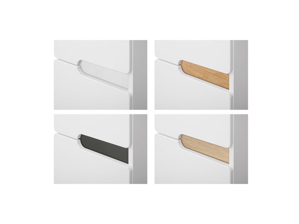 Korpus skříněk je vyroben z lakované LTD desky tl. 16 mm v bílým lakem ve vysokém lesku. Čelní plochy a dvířka s frézovanými úchytkami jsou vyrobeny z MDF desky tl. 16 mm s povrchovou úpravou bílou lesklou fólií. Součástí každé skříňky jsou 4 vyměnitelné dekorační lišty (bílá, antracit, dub country, dub urban) a je jen na Vás, kterou si při montáži zvolíte.