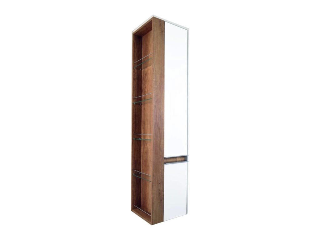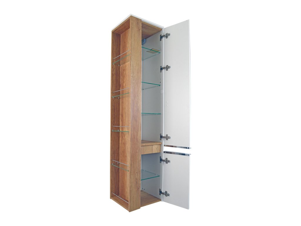 Korpus skříňky je z 16 mm LTD desky lakované bílým lakem ve vysokém lesku v kombinaci s prvky v dekoru dub Country. Dvířka jsou z LTD desky 16 mm rovněž lakované bílým lakem ve vysokém lesku. Skříňka je doplněna praktickými skleněnými policemi s ohrádkou na pravém nebo levém vnějším boku skříňky.