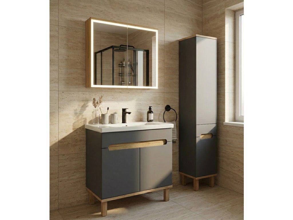 Série nábytku Orion v moderní kombinaci lakovaných ploch v šedé (antracitové) barvě a doplňků v dekoru zlatý dub. Jako základ si můžete vybrat skříňku v šířce 60 nebo 80 cm s keramickým umyvadlem nebo skříňku s horní deskou připravenou pro instalaci deskového umyvadla a tu pak doplnit zrcadlovou skříňkou. Součástí série jsou samozřejmě i doplňkové skříňky (nízká, vysoká, závěsná horní).