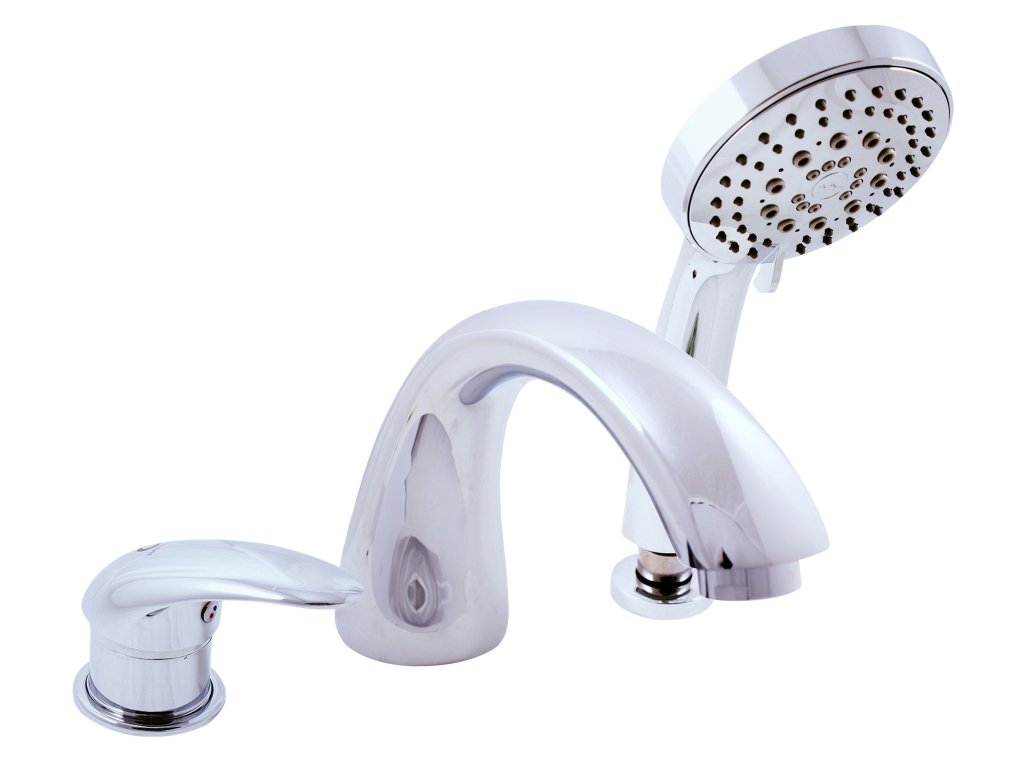Vodovodní baterie vanová stojánková tříotvorová s přepínačem v mixu, samonavíjecí sprchou a 2m hadicí.