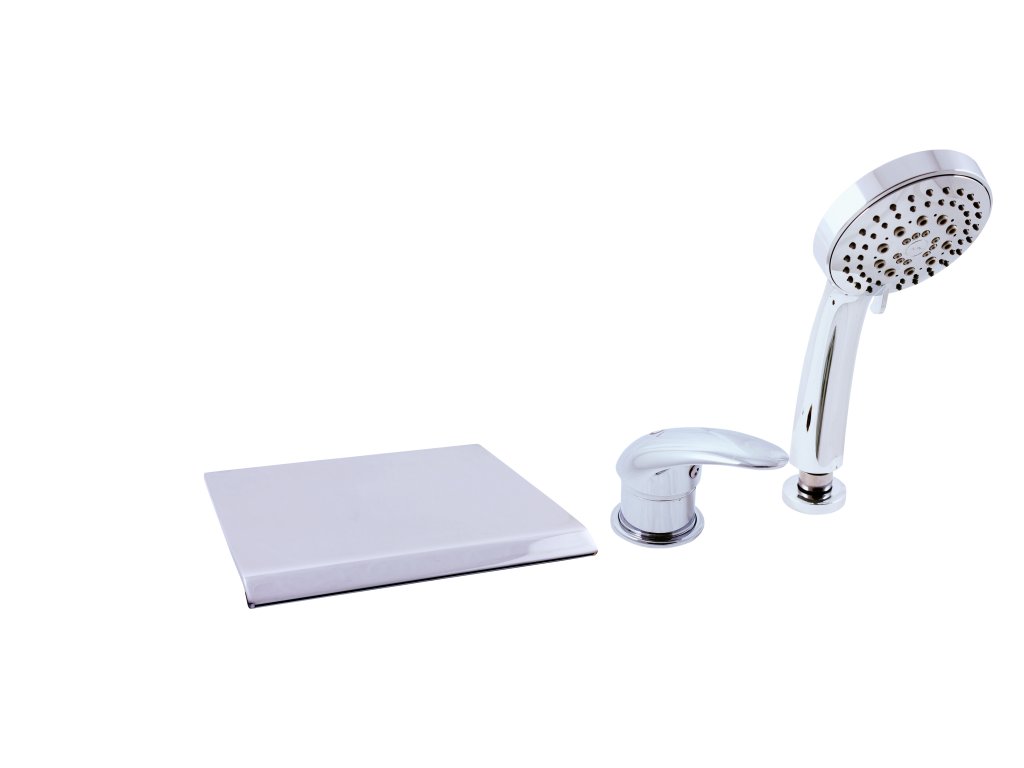 Vodovodní baterie vanová stojánková tříotvorová s přepínačem v mixu, samonavíjecí sprchou a 2m hadicí.