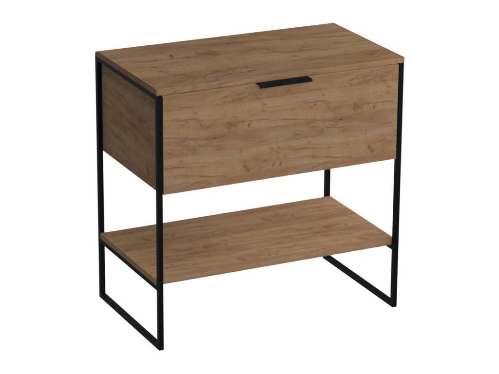 Základ skříněk je tvořen kovovou konstrukcí z tenkostěnných profilů v povrchové úpravě černým matným lakem. Samotný korpus skříňky, čelní plochy a police jsou z LTD desky v dekoru dub Gold Craft. Zásuvky a dvířka jsou doplněny kovovými úchytkami v povrchové úpravě černým matným lakem.