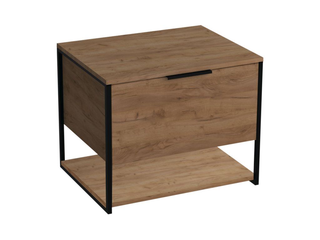 Základ skříněk je tvořen kovovou konstrukcí z tenkostěnných profilů v povrchové úpravě černým matným lakem. Samotný korpus skříňky, čelní plochy a police jsou z LTD desky v dekoru dub Gold Craft. Zásuvky a dvířka jsou doplněny kovovými úchytkami v povrchové úpravě černým matným lakem.