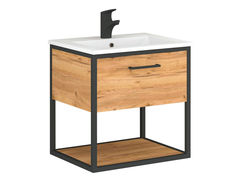 Základ skříňky je tvořen kovovou konstrukcí z tenkostěnných profilů 20x20 mm v povrchové úpravě černým matným lakem. Korpus skříňky, police a čelo zásuvky je z LTD desky 16 mm v dekoru Dub Country. Skříňka je vybavena keramickým umyvadlem UM-SOLAR 50 s přepadem a otvorem pro montáž vodovodní baterie.