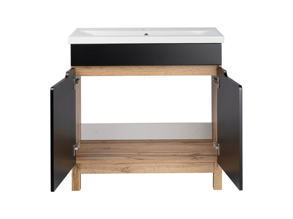 Skříňka s keramickým umyvadlem Alek 80-2D v provedení se dvěma dvířky se systémem tichého dovírání je určena k postavení na podlahu. Součástí skříňky je keramické umyvadlo UM-IHR 80 s přepadem a otvorem pro montáž vodovodní baterie.