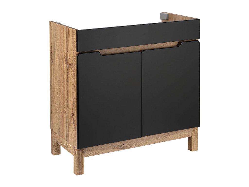 Korpus skříněk je vyroben z LTD desky tl. 16 mm v dekoru Dub Votan. Čelní plochy a dvířka s frézovanými úchytkami jsou vyrobeny z MDF desky tl. 16 mm s povrchovou úpravou matnou černou fólií.