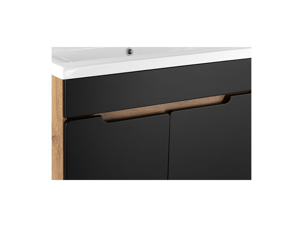 Atraktivní kombinace korpusu v dekoru Dub Votan a matných černých fóliovaných čelních ploch. Tato nadčasová kombinace barev vynikne v každé koupelně. Vybrat si můžete ze skříněk s keramickým umyvadlem v šířkách 60 a 80 cm a to v zásuvkovém provedení nebo s dvířky, a ty pak doplnit skříňkou nízkou a vysokou, a dosáhnout tak dostatečně velkého úložného prostoru v koupelně. Skříňky s umyvadlem lze pro úplnost doplnit zrcadlovými skříňkami v šířce 60 nebo 80 cm, které lze doplnit jakýmkoliv LED osvětlením z naší nabídky.