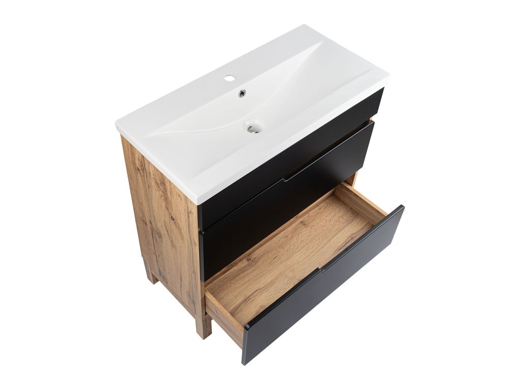 Atraktivní kombinace korpusu v dekoru Dub Votan a matných černých fóliovaných čelních ploch. Tato nadčasová kombinace barev vynikne v každé koupelně. Vybrat si můžete ze skříněk s keramickým umyvadlem v šířkách 60 a 80 cm a to v zásuvkovém provedení nebo s dvířky, a ty pak doplnit skříňkou nízkou a vysokou, a dosáhnout tak dostatečně velkého úložného prostoru v koupelně. Skříňky s umyvadlem lze pro úplnost doplnit zrcadlovými skříňkami v šířce 60 nebo 80 cm, které lze doplnit jakýmkoliv LED osvětlením z naší nabídky.