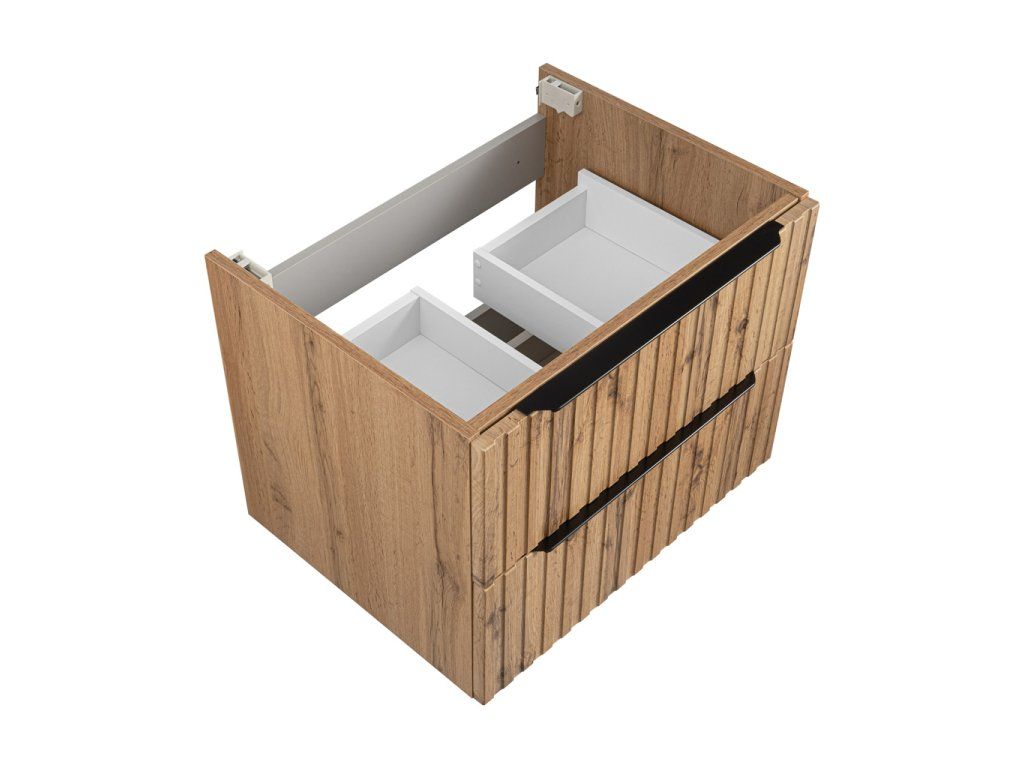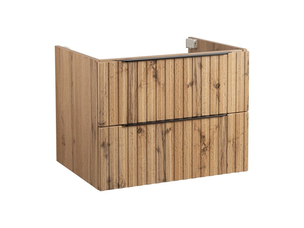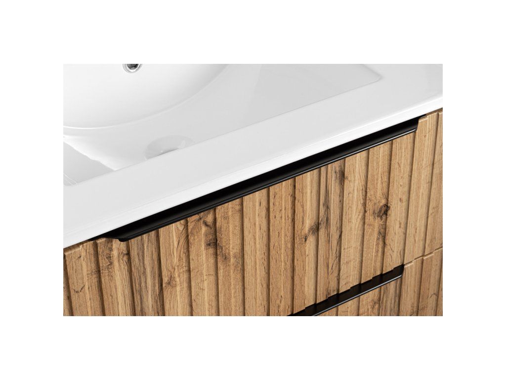 Atraktivní kombinace korpusu a profilovaných fóliovaných čelních ploch v dekoru Dub Wotan . Tento nadčasový design vynikne v každé koupelně. Modelová řada se skládá ze skříňky s keramickým umyvadlem v šířce 60 cm v zásuvkovém provedení doplněné skříňkou vysokou s dostatečně velkým úložným prostorem. Skříňku s umyvadlem lze pro úplnost doplnit zrcadlovou skříňkou v šířce 60 cm, kterou lze doplnit jakýmkoliv LED osvětlením z naší nabídky.