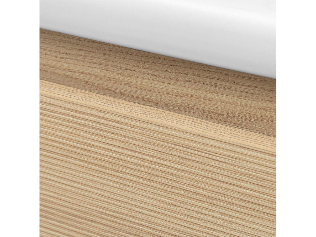 Korpus skříněk a vnitřní police jsou vyrobeny z LTD desky tloušťky 16 mm v dekoru dub vicenza, čela zásuvek a dvířka jsou z LTD desky 16 mm v dekoru dub linea. Hrany nábytku jsou ohraněné kvalitní a trvanlivou ABS hranou. Zásuvky na pojezdech se systémem tichého dovírání a dvířka, zavěšená na pantech se systémem SoftClose, jsou v bezúchytkovém provedení.