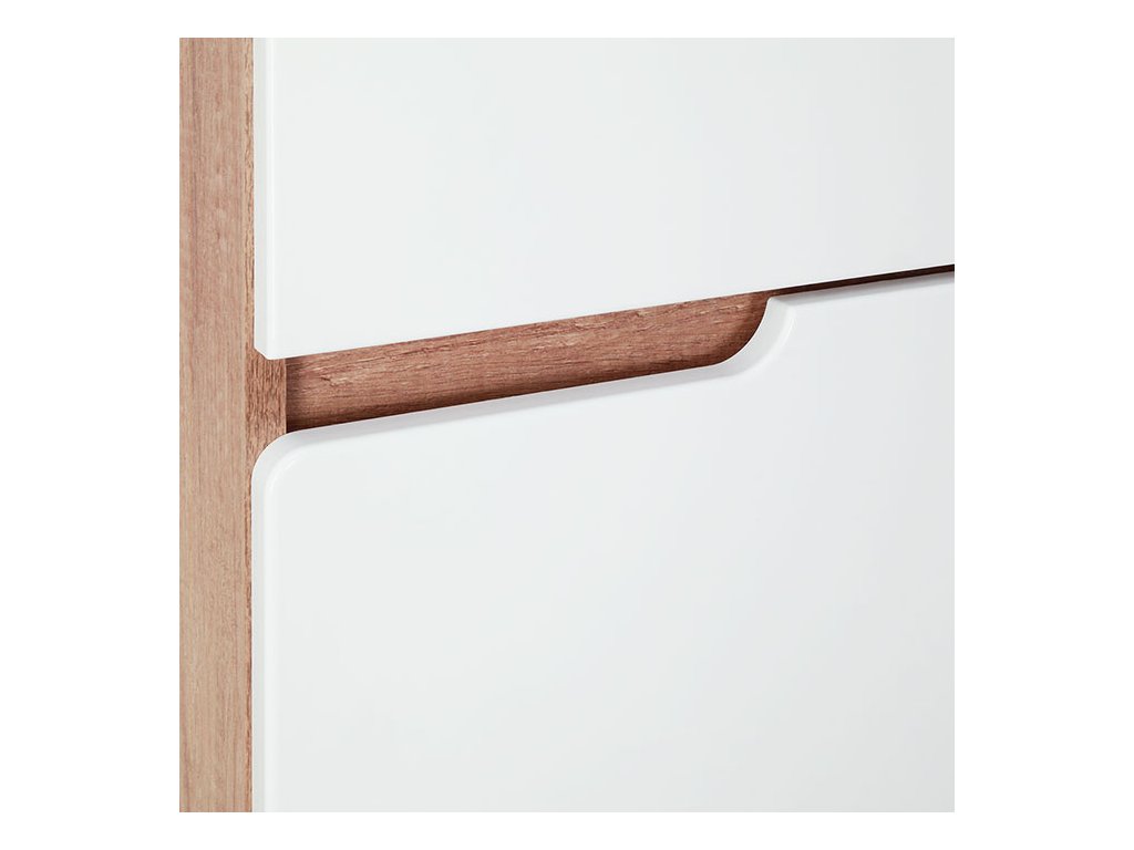 Korpus skříněk je z 16 mm LTD desky v dekoru Dub Country. Čela zásuvek s frézovanými úchyty jsou z MDF desky 16 mm s povrchovou úpravou lesklou fólií v bílé barvě. Nohy skříňky v dekoru Dub Country jsou vyrobeny z MDF desky 50 mm.