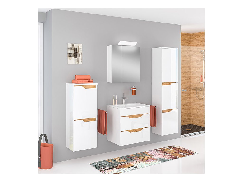 Korpus skříněk je z 16 mm LTD desky lakované bílým lakem ve vysokém lesku. Čela zásuvek a dvířka jsou z MDF desky tl. 16 mm potažené bílou lesklou fólií. Nábytek je doplněn vyměnitelnými dekoračními lištami v bavě bílá, dub country, dub urban, antracit.