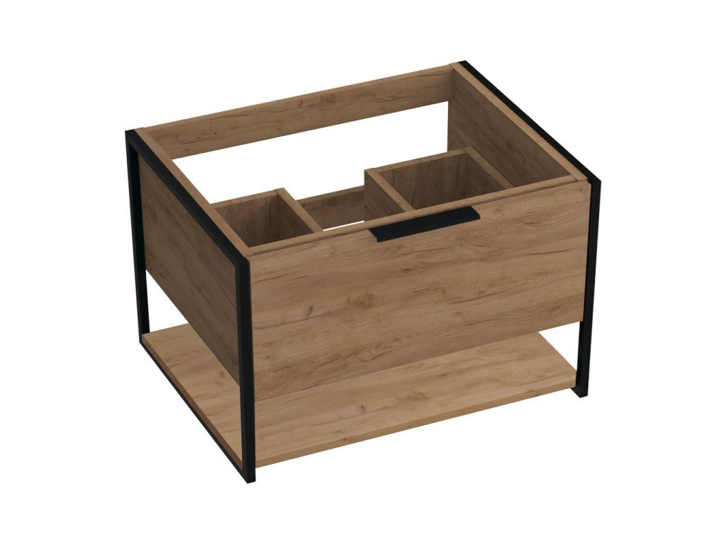 Základ skříněk je tvořen kovovou konstrukcí z tenkostěnných profilů v povrchové úpravě černým matným lakem. Samotný korpus skříňky, čelní plochy a police jsou z LTD desky v dekoru dub Gold Craft. Zásuvky a dvířka jsou doplněny kovovými úchytkami v povrchové úpravě černým matným lakem.
