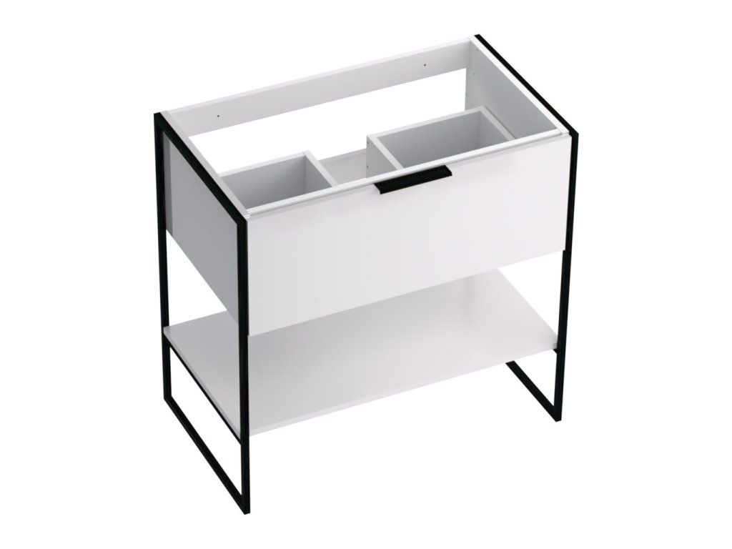 Základ skříněk je tvořen kovovou konstrukcí z tenkostěnných profilů v povrchové úpravě černým matným lakem. Samotný korpus skříňky, čelní plochy a police jsou z LTD desky v povrchové úpravě lesklým bílým lakem. Zásuvky a dvířka jsou doplněny kovovými úchytkami v povrchové úpravě černým matným lakem.