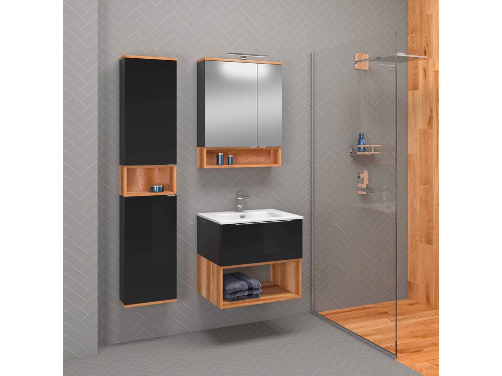 Korpus skříněk, čelní plochy a police jsou vyrobeny z LTD desky s velmi pěknou kombinací dekoru Dub Country a černých lesklých ploch.