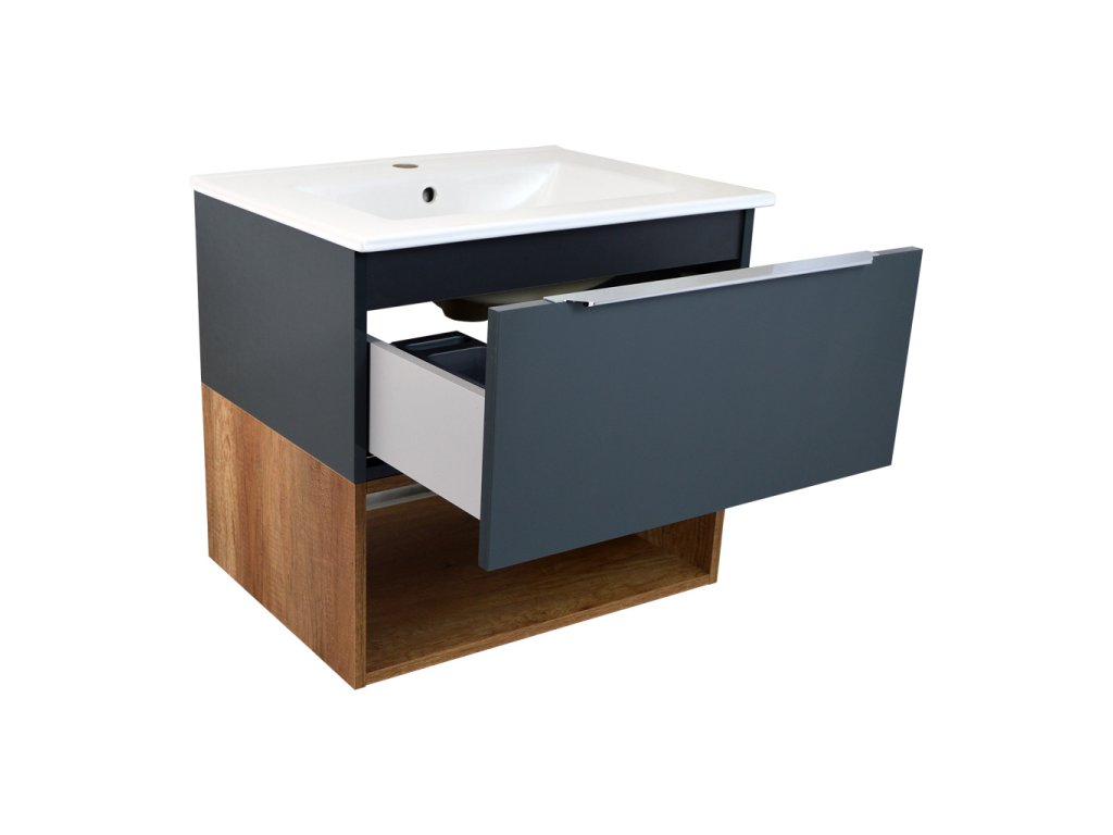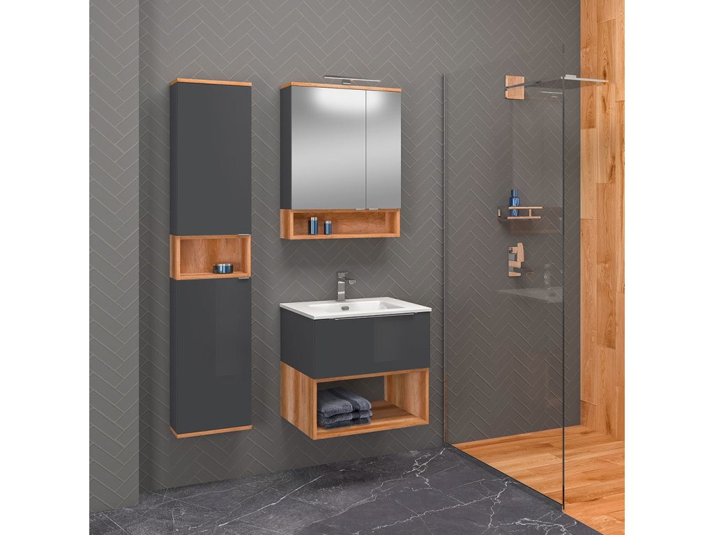 Korpus skříněk, čelní plochy a police jsou vyrobeny z LTD desky s velmi pěknou kombinací dekoru Dub Country a antracitových lesklých ploch.