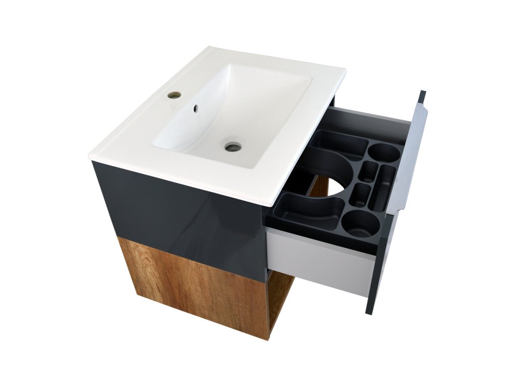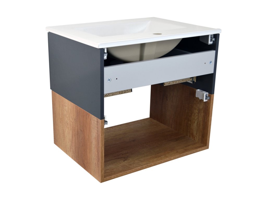 Skříňka s keramickým umyvadlem Neveda CA 60 je určena k zavěšení na zeď pomocí rektifikačních závěsů. Součástí skříňky je keramické umyvadlo UM-ASU 60 s přepadem a otvorem pro montáž vodovodní baterie. Praktickým doplňkem je plastový organizér umístěný v horní zásuvce. Skříňka s umyvadlem i spodní otevřená police se zavěšují na zeď samostatně pomocí rektifikačních závěsů.