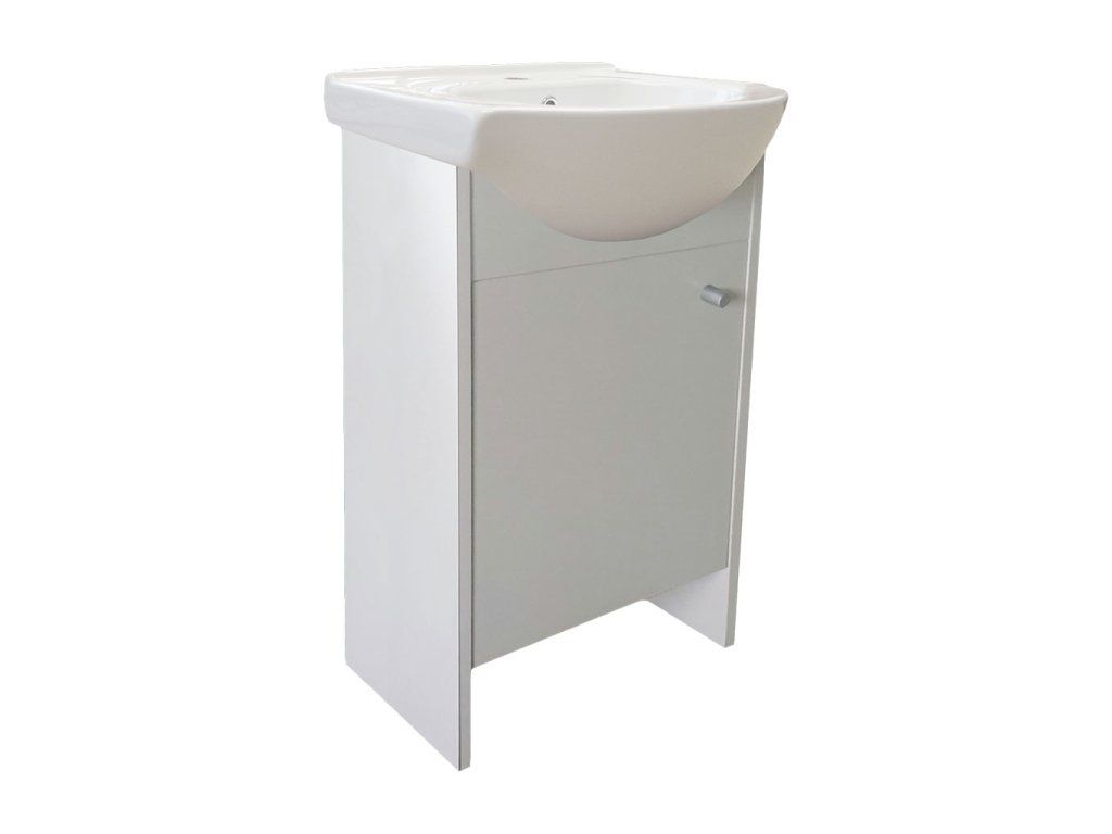 Skříňka s keramickým umyvadlem Paola 45 P/L je určena k postavení na podlahu. Je doplněna keramickým umyvadlem Bahama 45 s přepadem a otvorem pro montáž vodovodní baterie.