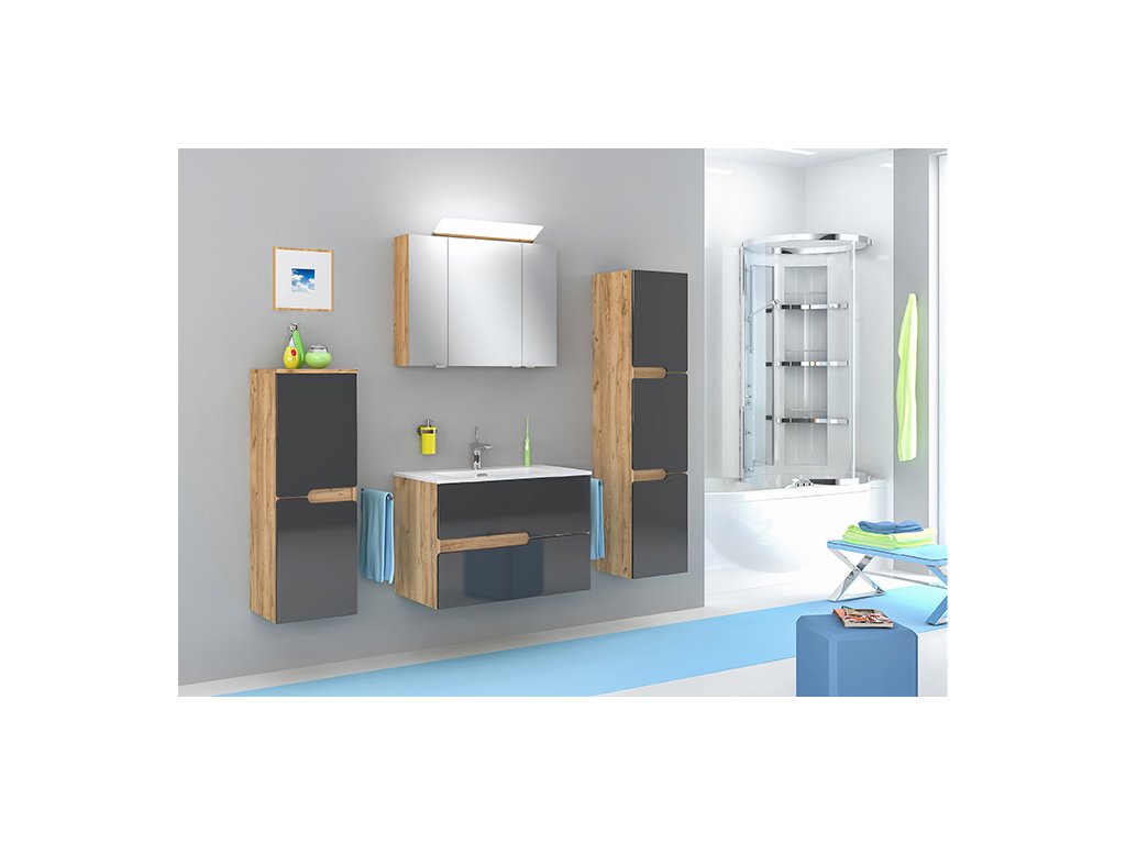 Korpus skříněk je vyroben z LTD desky tl. 16 mm v dekoru dub Country. Čelní plochy a dvířka s frézovanými úchytkami jsou vyrobeny z MDF desky tl. 16 mm s povrchovou úpravou lesklou fólií v barvě antracit.