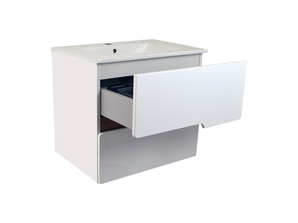 Skříňka s keramickým umyvadlem Spectrum W 60 je určena k zavěšení na zeď pomocí rektifikačních závěsů. Součástí skříňky je keramické umyvadlo UM-ASU 60 s přepadem a otvorem pro montáž vodovodní baterie (viz obrázek v galerii). Praktickým doplňkem je plastový organizér umístěný v horní zásuvce.