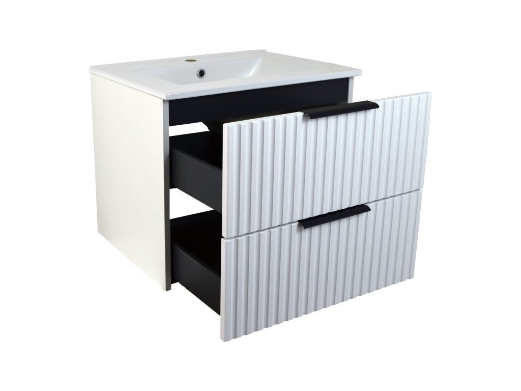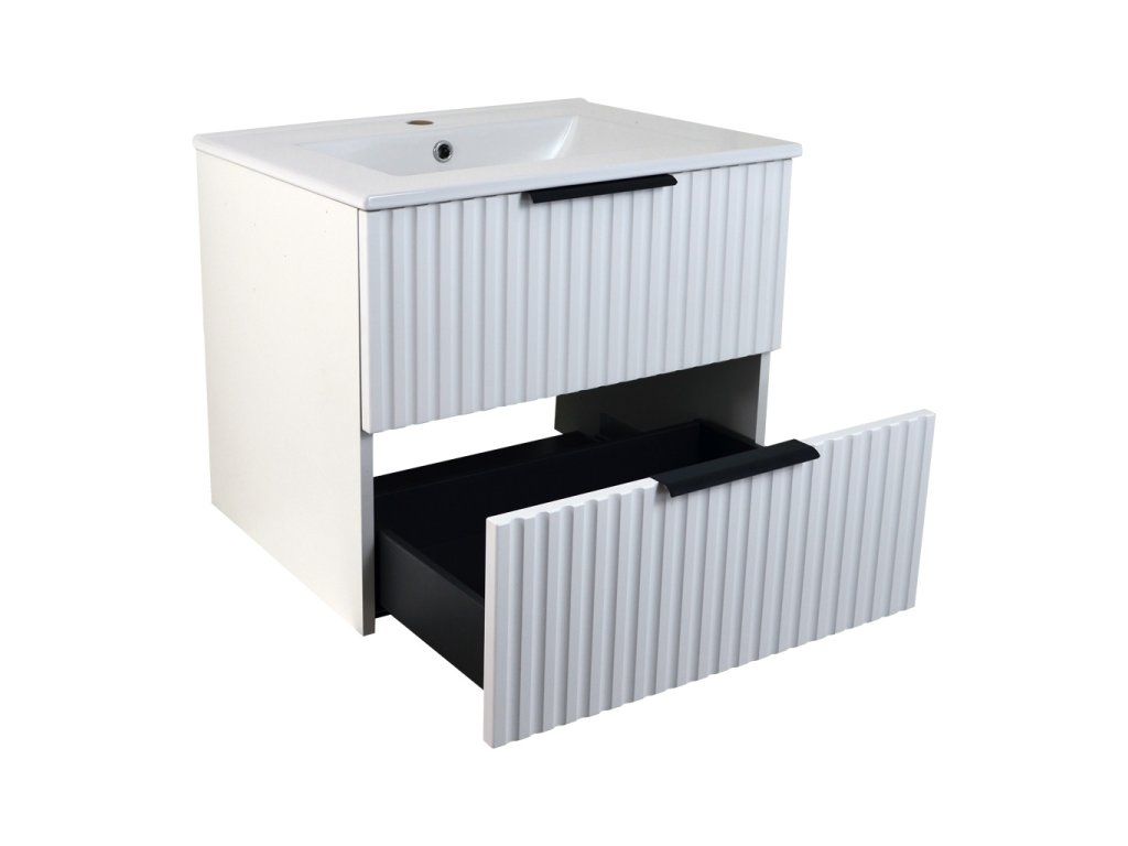 Korpusy skříněk je vyrobeny z 16 mm LTD desky. Čela skříněk jsou z MDF desky s fólií v bílé barvě. Čela jsou zdobeny elegantní vlnkou, která dodává moderní a nevšední vzhled naší koupelně.