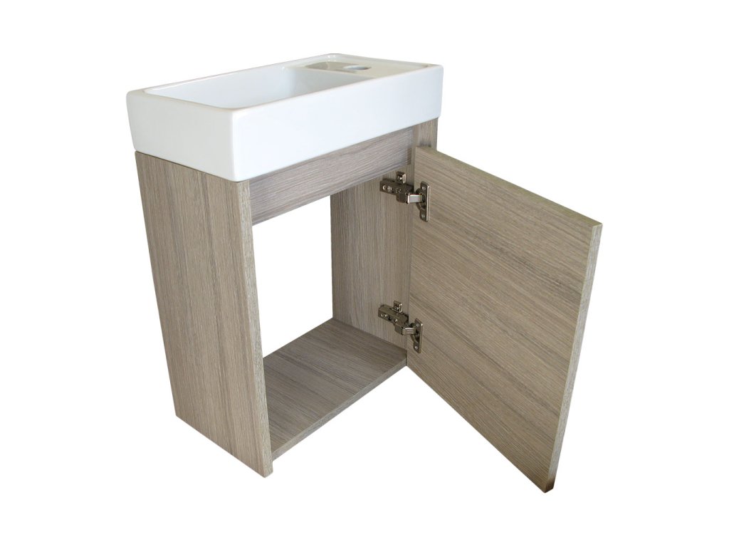 Prostorově úsporná koupelnová skříňka závěsná s keramickým umyvadlem Marta 40 Oak P/L. Vhodná především do malých prostor, např. WC a pod.