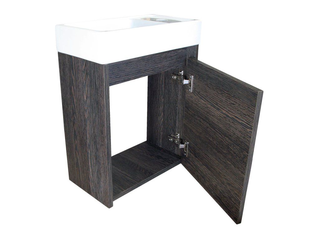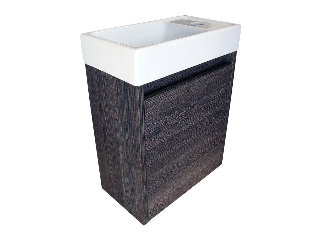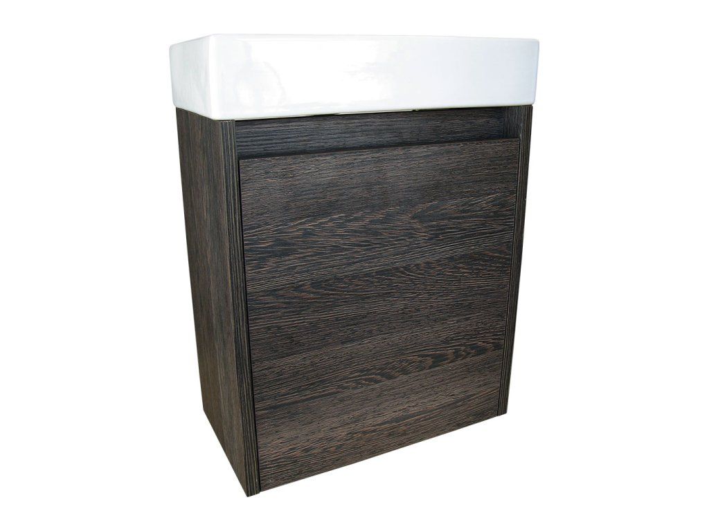 Prostorově úsporná koupelnová skříňka závěsná s keramickým umyvadlem Marta 40 Wenge P/L. Vhodná především do malých prostor, např. WC a pod.