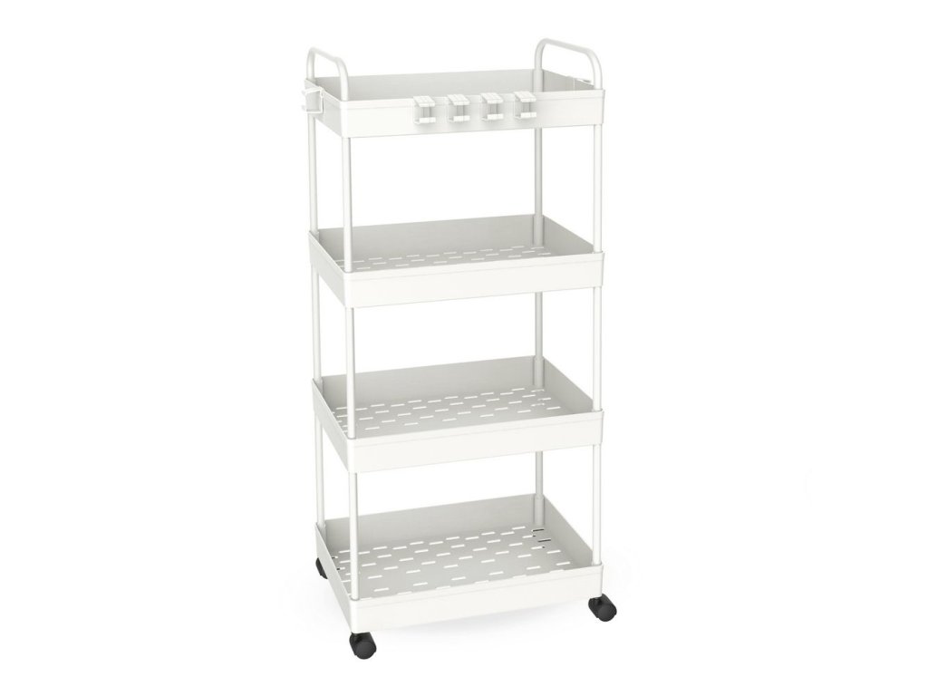 Bílý regálek na kolečkách z odolného plastu je praktickým a estetickým řešením do každé místnosti. Pevný kovový rám zajišťuje stabilitu a odolnost a namontovaná kolečka umožňují snadné přemisťování police podle vašich potřeb. Je vybavena 4 prostornými koši, umožňuje pohodlné ukládání a organizaci předmětů v koupelně, kuchyni nebo jiných místnostech. Další výhodou je 6 praktických háčků, které lze odejmout a libovolně umístit na police, což optimalizuje využití prostoru. Polička se snadno sestavuje – sestavení prvků podle přiloženého návodu nevyžaduje žádné nářadí, což z ní dělá ideální volbu pro každého, kdo si cení pohodlí a funkčnosti.