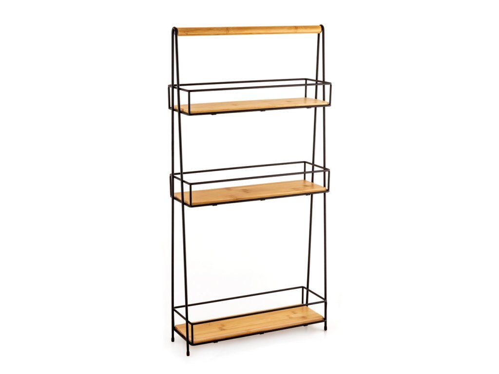Regál spojuje funkčnost a eleganci díky použití oceli lakované sytě černou barvou a přírodního bambusového dřeva. Má tři police, z toho jednu vysokou, která se skvěle hodí pro uložení i toho nejvyššího příslušenství v různých místnostech, jako je koupelna, kuchyně nebo předsíň. Police jsou vyrobeny z bambusu, který dodává teplo a lehkost. Regál je díky svým malým rozměrům velmi polohovatelný a najde své místo i v menších prostorech, přičemž nabízí praktické úložné řešení.