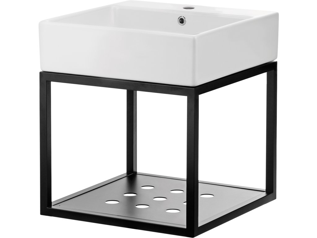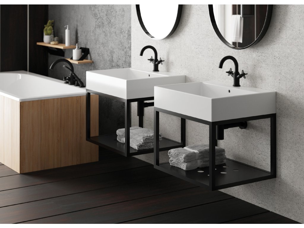 Umyvadlo umístěné na závěsné koupelnové konzoli Temisto je sestava, která potěší příznivce jednoduchých, stylových a rychlých řešení. Nedotčená bílá keramika a minimalistické geometrické linie umyvadla na desku dokonale ladí s tvrdostí černé ocelové konzoly.