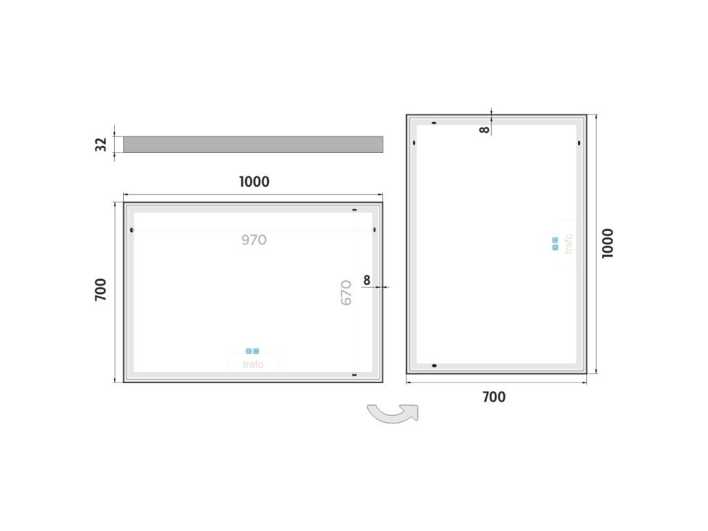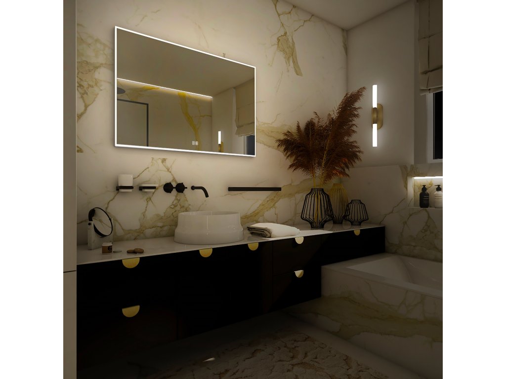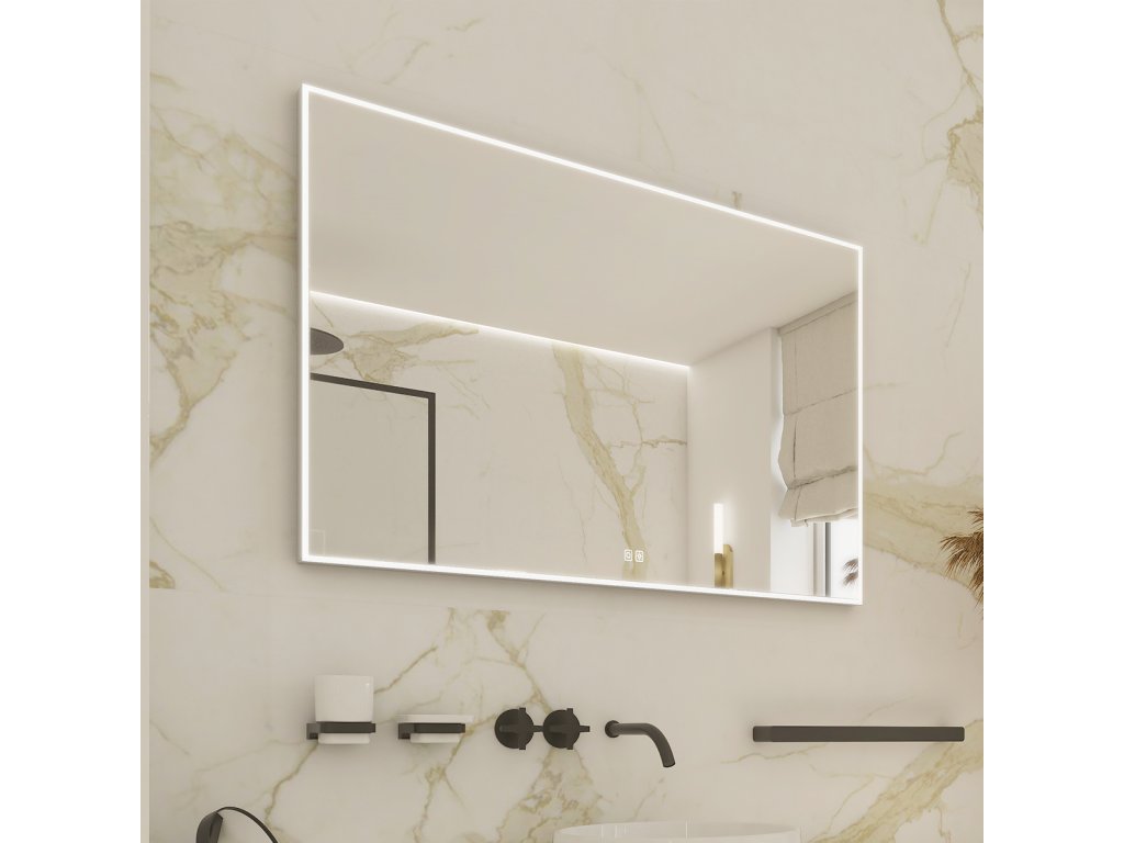 Obdélníkové zrcadlo s rámem s ostrými rohy a celoobvodovým svícením pro dokonalé a rovnoměrné osvětlení.Zrcadlo se ovládá dvěma dotykovými podsvícenými senzory, které umožňují změnu barvy světla, nastavení intenzity osvětlení (stmívání) a disponují paměťovou funkcí pro uložení posledního nastavení. Kromě toho lze zrcadlo ovládat i pomocí nástěnného vypínače, což zvyšuje jeho flexibilitu a pohodlí použití.