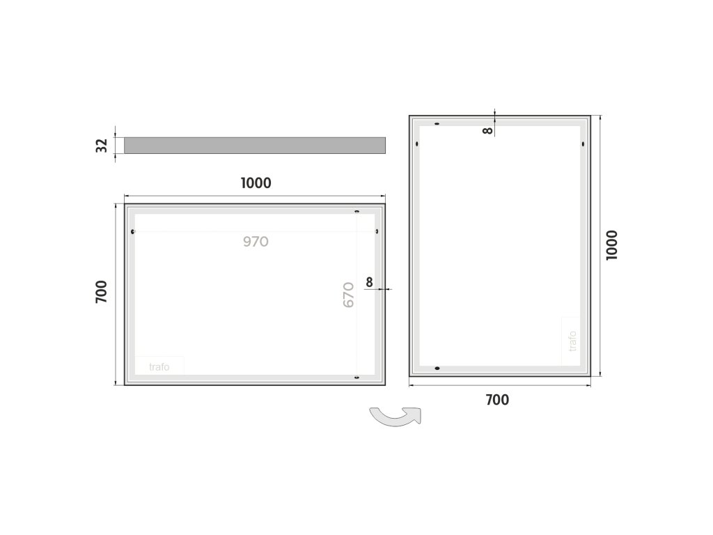 Obdélníkové zrcadlo s rámem s ostrými rohy a celoobvodovým svícením pro dokonalé a rovnoměrné osvětlení.Zrcadlo bez integrovaného vypínače je určené k připojení a ovládání nástěnným vypínačem. Barva světla zrcadla je pevně nastavena.