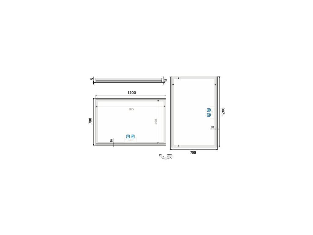 Obdélníkové bezrámové zrcadlo s ostrými rohy a podsvícením ze spodu a shora pro rovnoměrné a stylové osvětlení.Zrcadlo se ovládá dvěma dotykovými podsvícenými senzory, které umožňují změnu barvy podsvícení, nastavení intenzity osvětlení (stmívání) a disponují paměťovou funkcí pro uložení posledního nastavení. Kromě toho lze zrcadlo ovládat i pomocí nástěnného vypínače, což zvyšuje jeho flexibilitu a pohodlí použití.