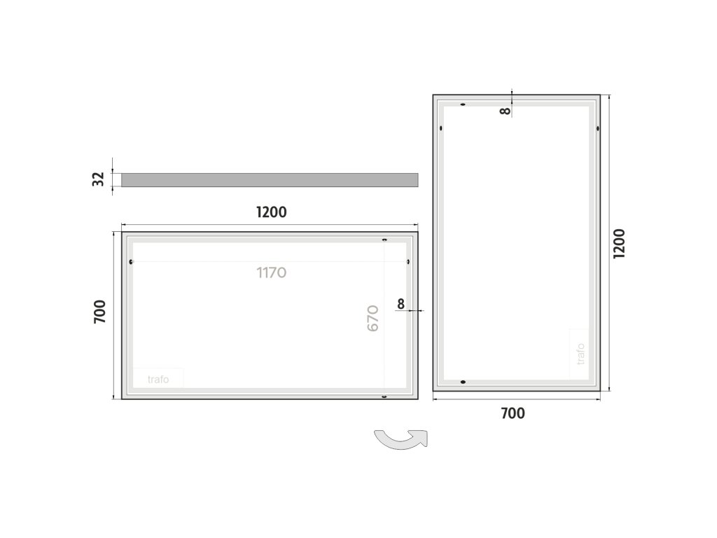 Obdélníkové zrcadlo s rámem s ostrými rohy a celoobvodovým svícením pro dokonalé a rovnoměrné osvětlení.Zrcadlo bez integrovaného vypínače je určené k připojení a ovládání nástěnným vypínačem. Barva světla zrcadla je pevně nastavena.