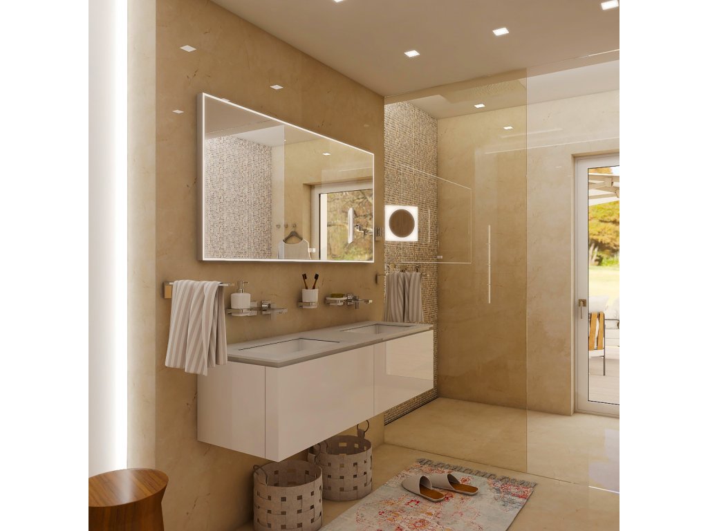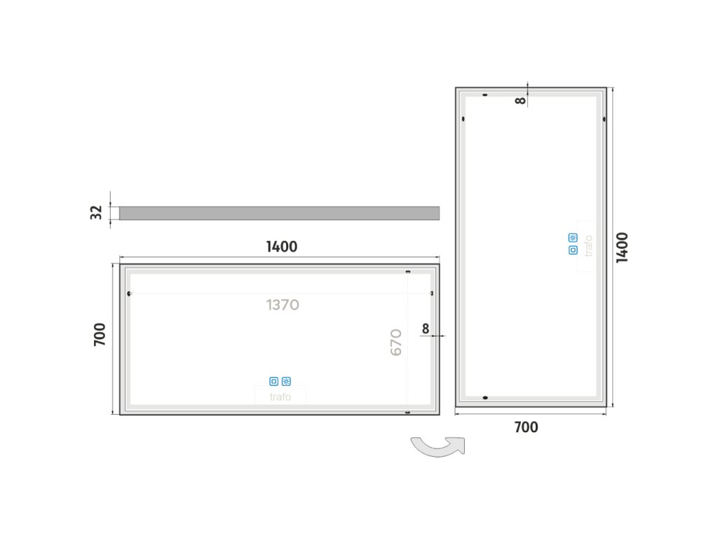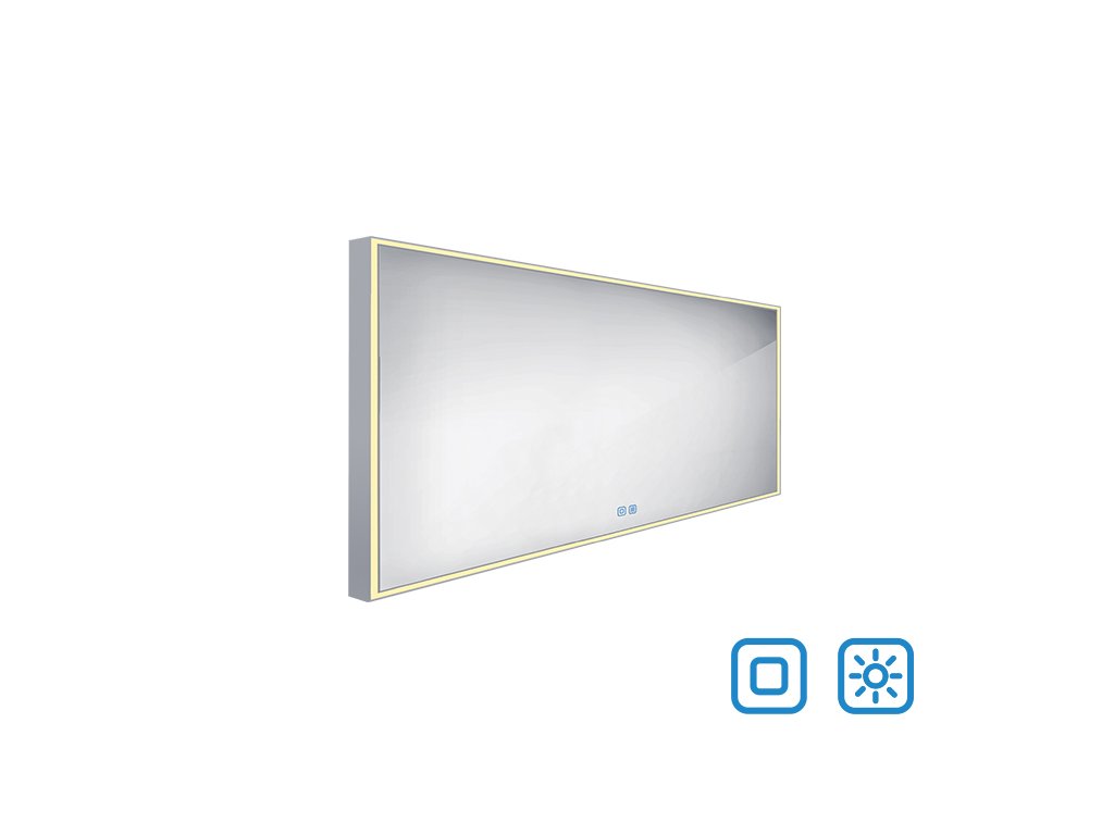Obdélníkové zrcadlo s rámem s ostrými rohy a celoobvodovým svícením pro dokonalé a rovnoměrné osvětlení.Zrcadlo se ovládá dvěma dotykovými podsvícenými senzory, které umožňují změnu barvy světla, nastavení intenzity osvětlení (stmívání) a disponují paměťovou funkcí pro uložení posledního nastavení. Kromě toho lze zrcadlo ovládat i pomocí nástěnného vypínače, což zvyšuje jeho flexibilitu a pohodlí použití.