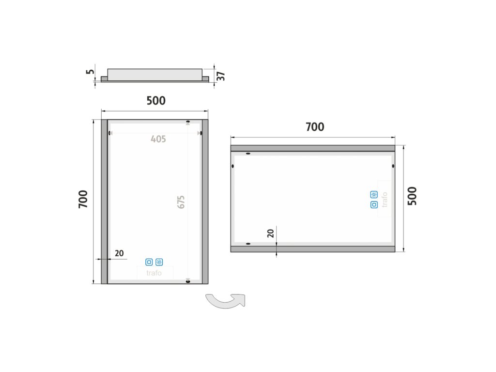 Obdélníkové bezrámové zrcadlo s ostrými rohy a podsvícením ze stran pro moderní a elegantní vzhled.Zrcadlo se ovládá dvěma dotykovými podsvícenými senzory, které umožňují změnu barvy podsvícení, nastavení intenzity osvětlení (stmívání) a disponují paměťovou funkcí pro uložení posledního nastavení. Kromě toho lze zrcadlo ovládat i pomocí nástěnného vypínače, což zvyšuje jeho flexibilitu a pohodlí použití.