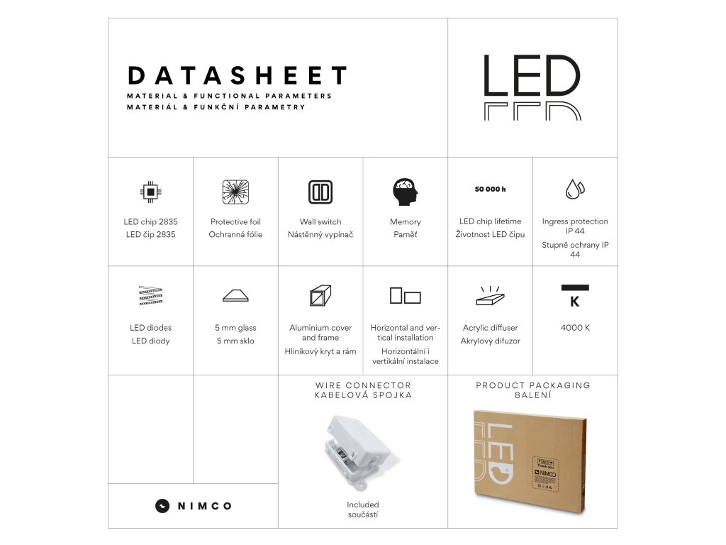 Zrcadlo využívá nejmodernější LED čipy SMD 2835, které jsou známé svou vysokou svítivostí, energetickou úsporností a dlouhou životností. Hustota čipů 96/m, životnost 50 000 hodin. Parametry LED: Survival Factor = 1, Lumen Maintenance Factor 0,99 a Flicker Metric 0,02, pak zajišťují stabilní, bezblikavé a dlouhodobě konzistentní osvětlení.
