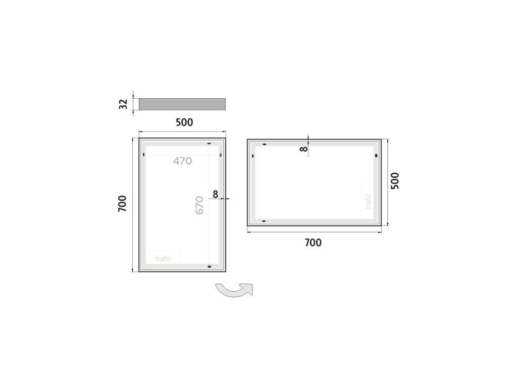 Obdélníkové zrcadlo s rámem s ostrými rohy a celoobvodovým svícením pro dokonalé a rovnoměrné osvětlení.Zrcadlo bez integrovaného vypínače je určené k připojení a ovládání nástěnným vypínačem. Barva světla zrcadla je pevně nastavena.