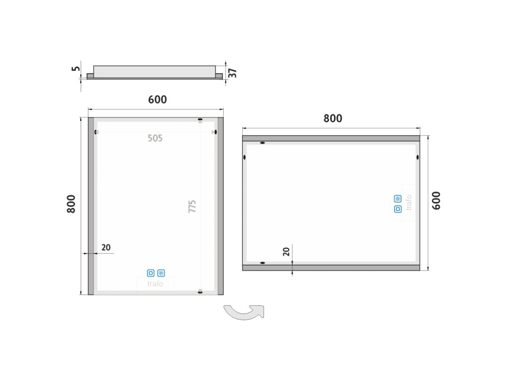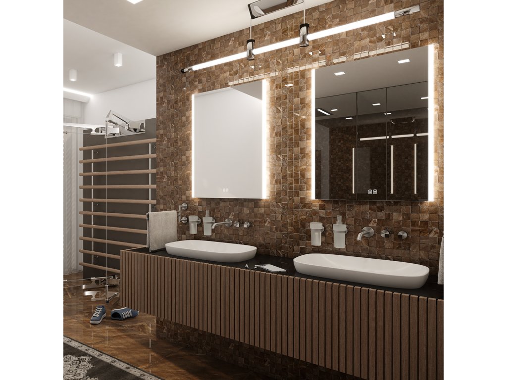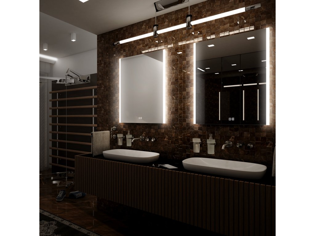 Obdélníkové bezrámové zrcadlo s ostrými rohy a podsvícením ze stran pro moderní a elegantní vzhled.Zrcadlo se ovládá dvěma dotykovými podsvícenými senzory, které umožňují změnu barvy podsvícení, nastavení intenzity osvětlení (stmívání) a disponují paměťovou funkcí pro uložení posledního nastavení. Kromě toho lze zrcadlo ovládat i pomocí nástěnného vypínače, což zvyšuje jeho flexibilitu a pohodlí použití.