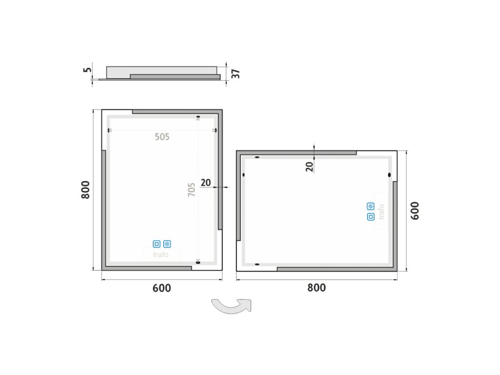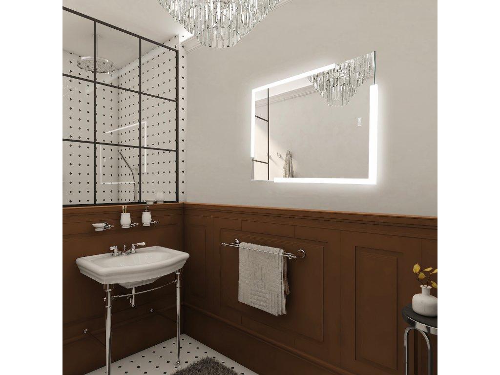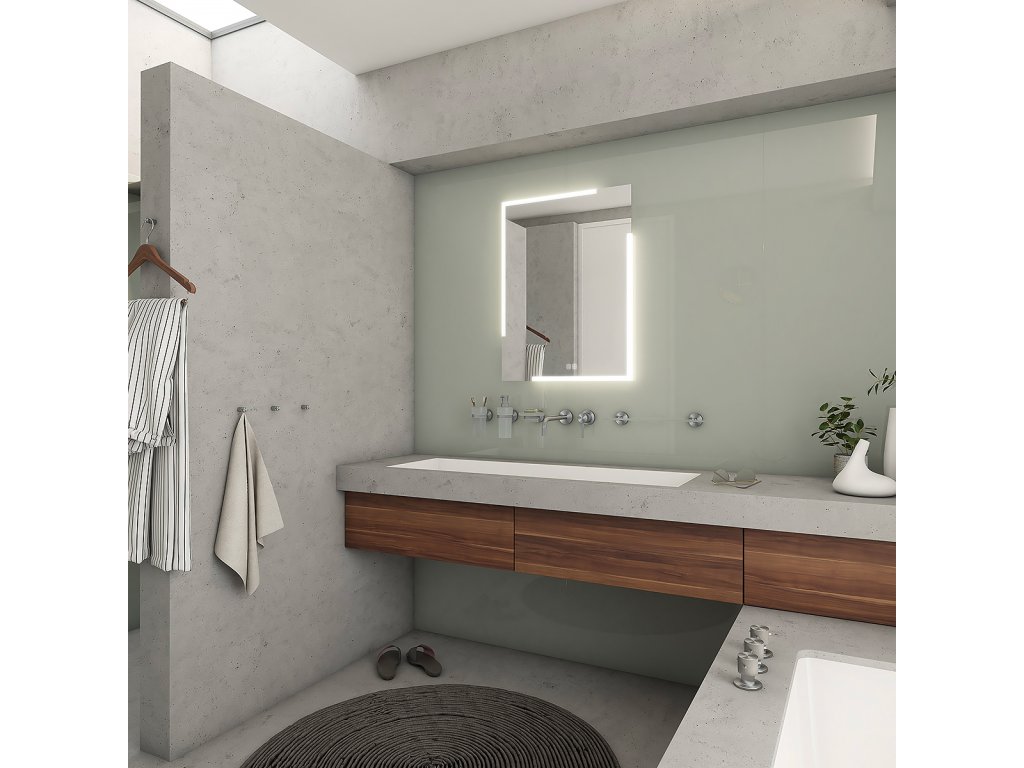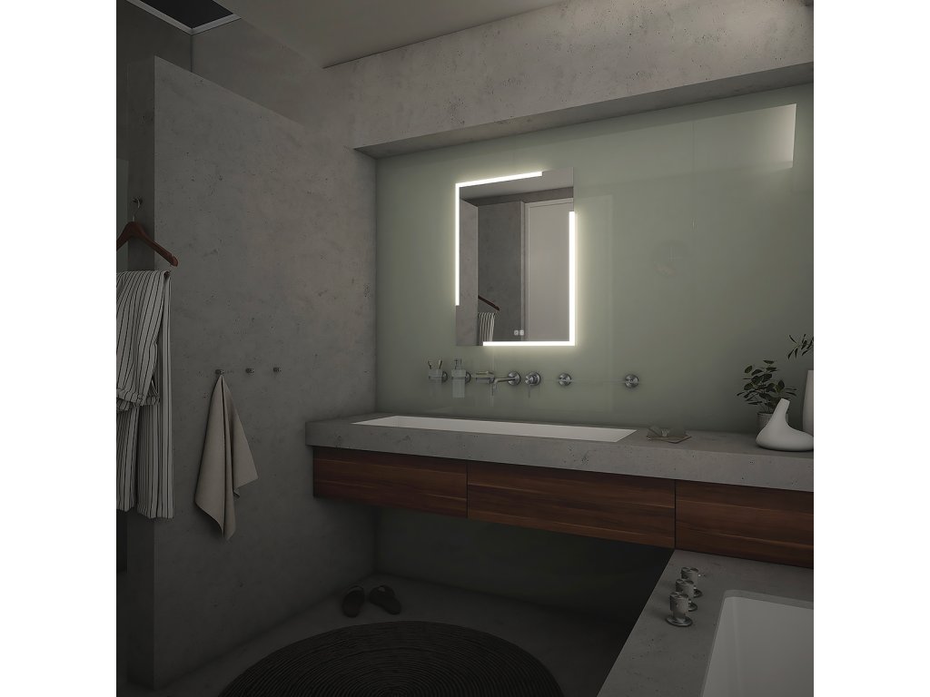 Obdélníkové bezrámové zrcadlo s ostrými rohy a celoobvodovým podsvícením pro dokonalé a rovnoměrné osvětlení.Zrcadlo se ovládá dvěma dotykovými podsvícenými senzory, které umožňují změnu barvy podsvícení, nastavení intenzity osvětlení (stmívání) a disponují paměťovou funkcí pro uložení posledního nastavení. Kromě toho lze zrcadlo ovládat i pomocí nástěnného vypínače, což zvyšuje jeho flexibilitu a pohodlí použití.