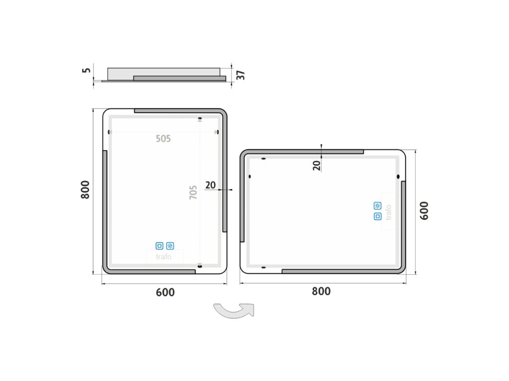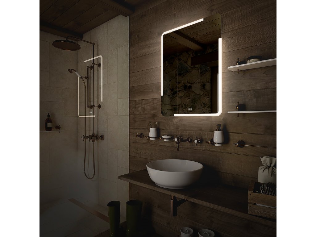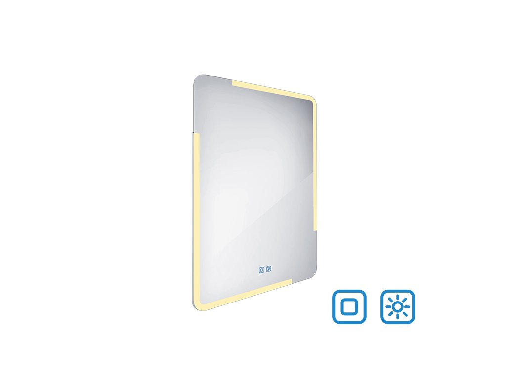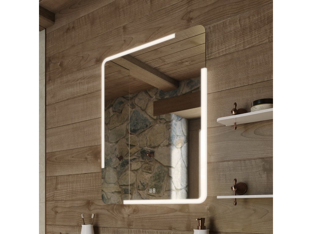 Obdélníkové bezrámové zrcadlo s oblými rohy a celoobvodovým podsvícením pro dokonalé a rovnoměrné osvětlení.Zrcadlo se ovládá dvěma dotykovými podsvícenými senzory, které umožňují změnu barvy podsvícení, nastavení intenzity osvětlení (stmívání) a disponují paměťovou funkcí pro uložení posledního nastavení. Kromě toho lze zrcadlo ovládat i pomocí nástěnného vypínače, což zvyšuje jeho flexibilitu a pohodlí použití.