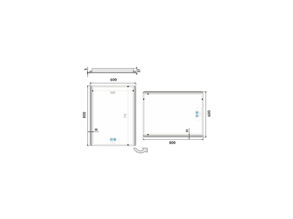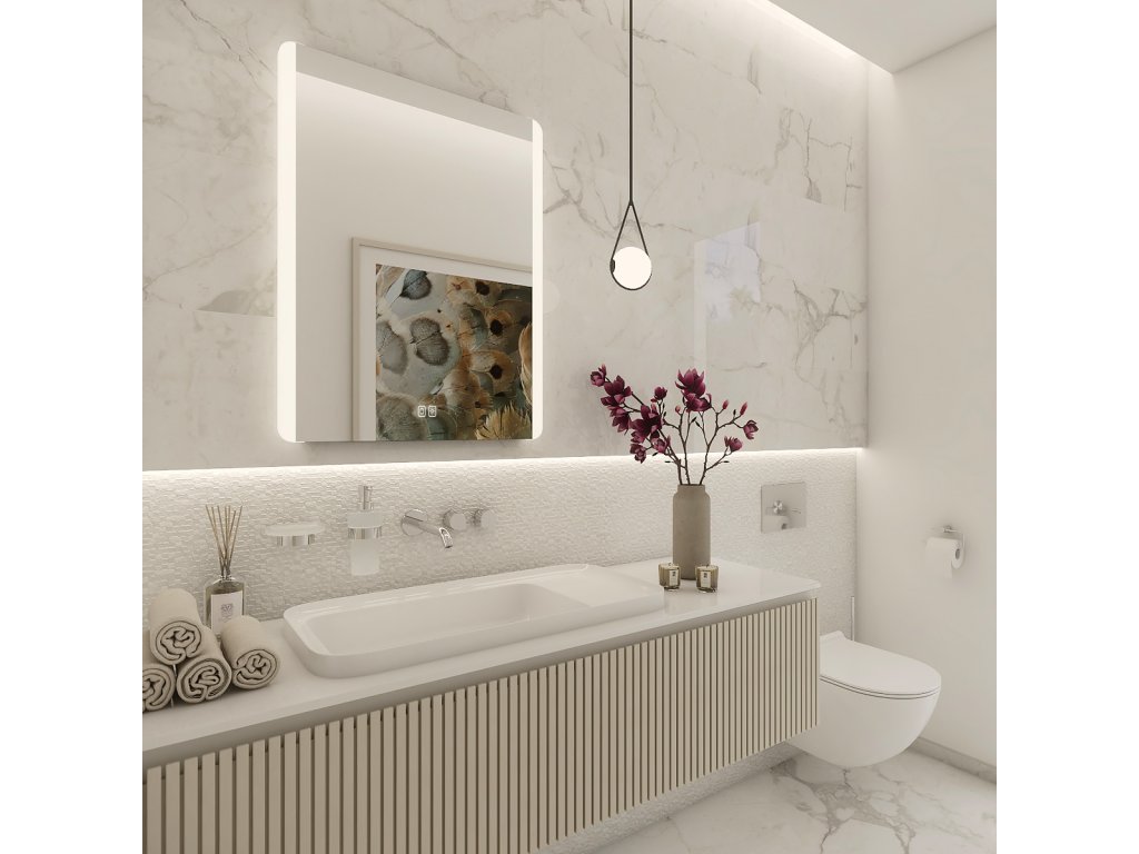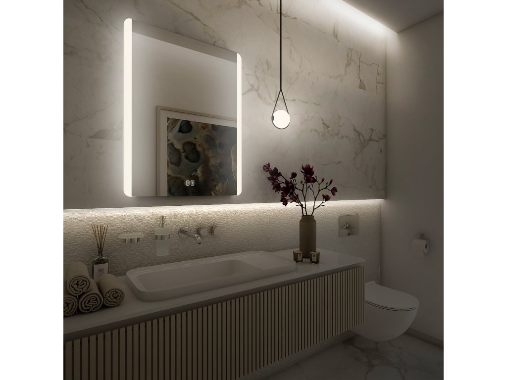 Obdélníkové bezrámové zrcadlo s oblými rohy a podsvícením ze stran pro moderní a elegantní vzhled.Zrcadlo se ovládá dvěma dotykovými podsvícenými senzory, které umožňují změnu barvy podsvícení, nastavení intenzity osvětlení (stmívání) a disponují paměťovou funkcí pro uložení posledního nastavení. Kromě toho lze zrcadlo ovládat i pomocí nástěnného vypínače, což zvyšuje jeho flexibilitu a pohodlí použití.